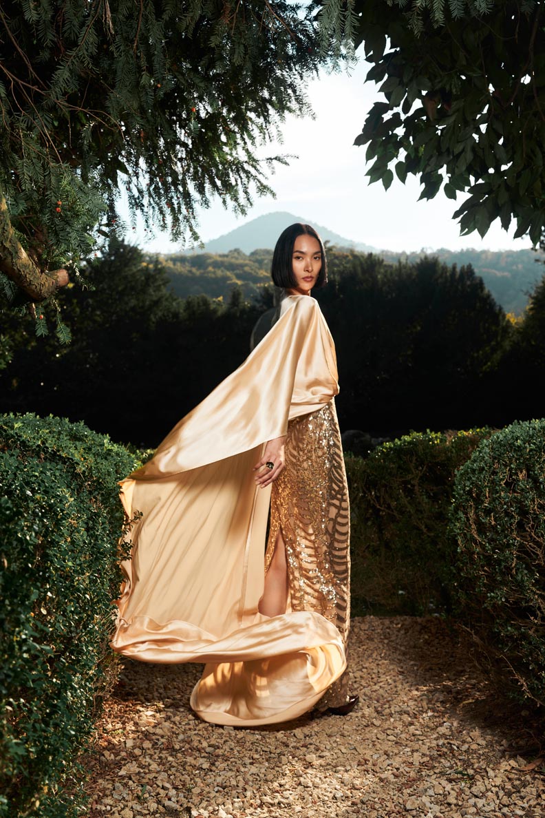 The Helia Dress reflects a sense of modern elegance through its fluid silhouette and luminous texture.