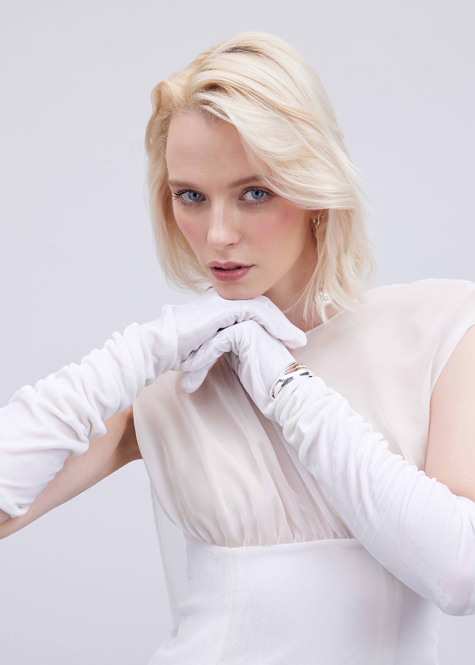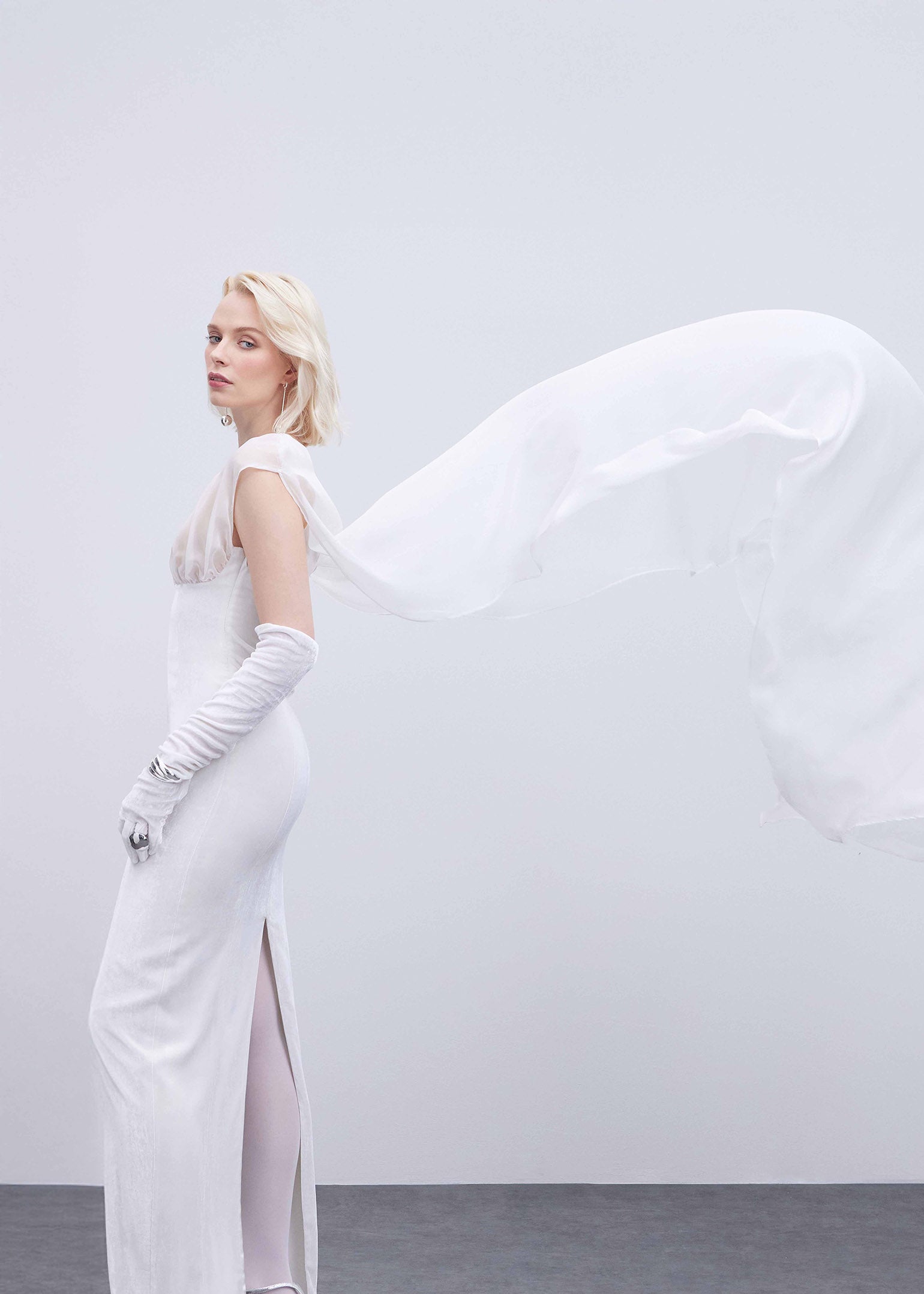 Crafted from soft white velvet with a full silk lining, it drapes gracefully to the floor, following the body with natural flow.